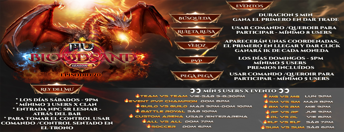 Bienvenido a la comunidad MU BLOODSAND / Since 2025 / Rey del Mu Todos los sabados-Guild Soccer Domingos (-3 GMT) / Recuerda registrarte en todas nuestras redes sociales / Visita la seccion grupo de wathsaap y reclama tu vip premium x 3 dias